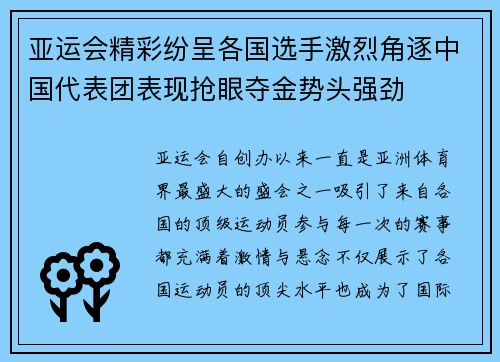 在2022年杭州亚运会中,中国代表团再次展现了强大的竞技实力,不仅突破了亚运会历史纪录,还成功创下了奖牌数的新高。这一成就不仅是中国体育近年来持续进步的象征,也体现了中国在世界体育舞台上日益崭露头角的实力。本文将从四个方面详细分析此次中国代表团的历史性突破,探讨其在金牌、奖牌总数、体育强国建设以及团...